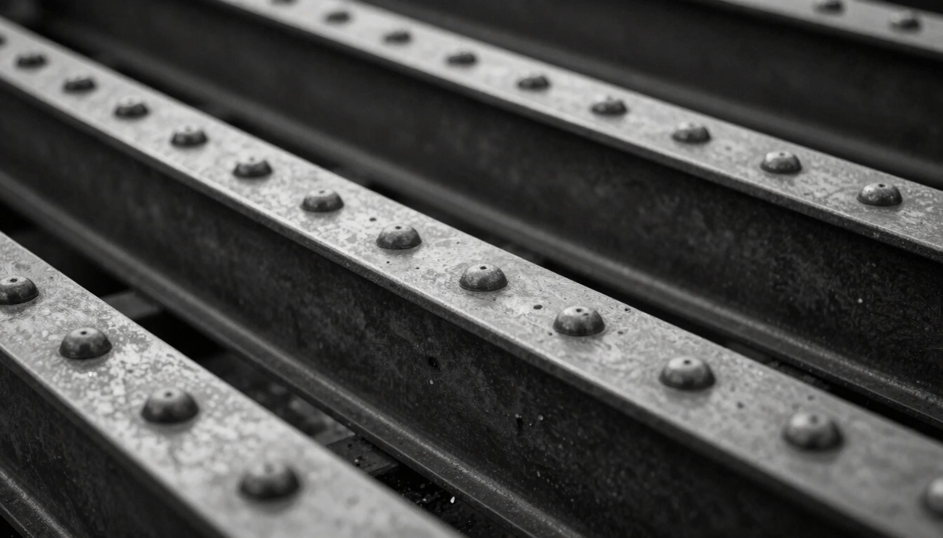 Symmetrical shot of finished structural steel beams in a modern architectural building, silver grey palette, North American / Mexican industrial design.